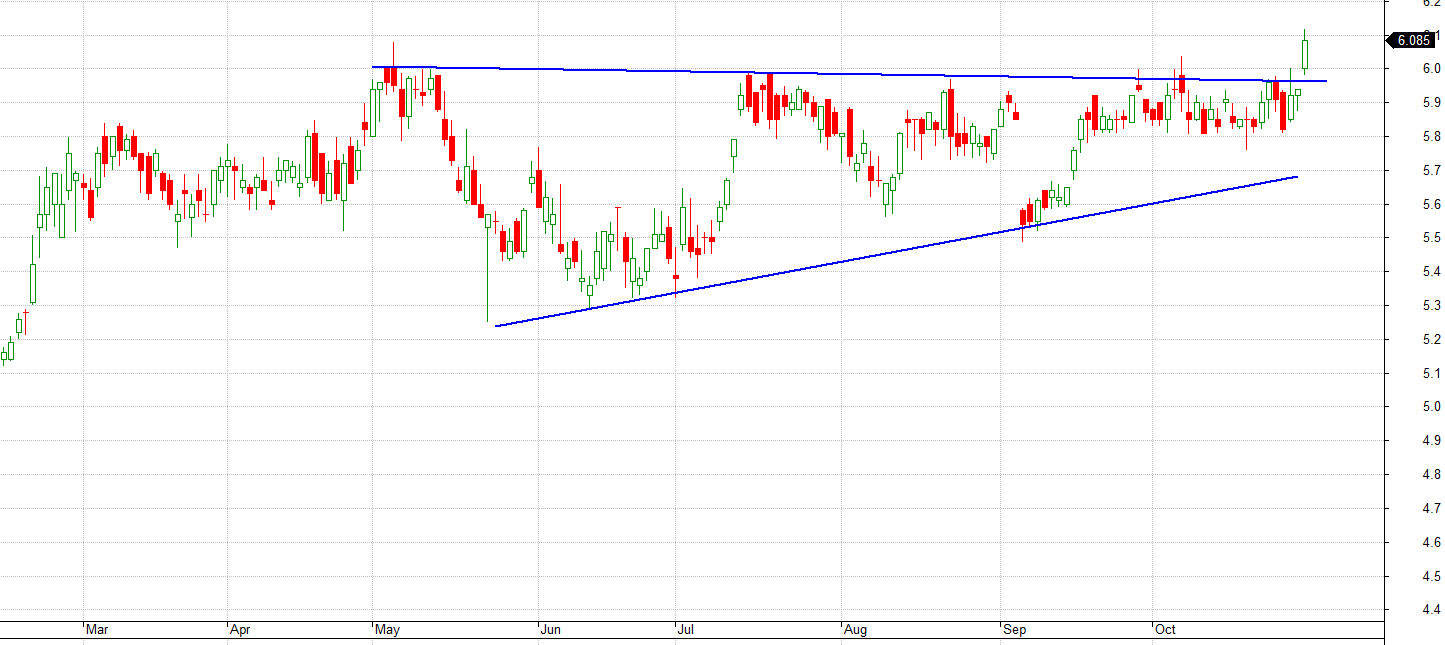 IAG has more than doubled its share price in the last 18 months, and up until May this year it was trending very strongly. Since peaking in May, the share price has come off a bit but not in a way that suggests a larger sell-off is around the corner. After easing back over May – June, the share price attempted to go to a new high before failing. You would assume this is negative, but in IAG’s case it is not. The share price didn’t get punished for failing to go to a new high. Instead, it has managed to congest under the high, making a few more attempts at pushing through. This means that there is a good chance of it breaking to the upside, and if it does, we could see a very impulsive move develop. On the back of today’s AGM, it appears as though this breakout is now starting to occur. We anticipate an eventual rally in the order of 80c, which would see it retesting its pre-GFC high. We are more bullish on QBE fundamentally so unless you are purely trading IAG from a technical point of view, you may consider using an eventual rally as an opportunity to take profits and switch to QBE.