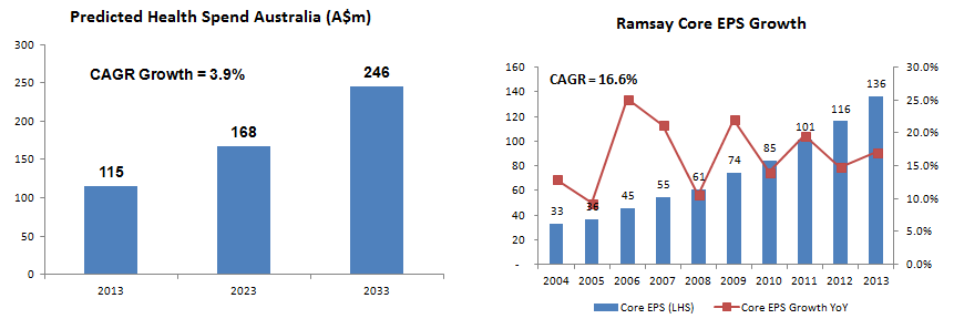 The aging population trend leads to a higher percentage of people in the over 65 age group. This is usually the retiree demographic, who no longer part of the work force but more importantly will spend a higher amount on health care than younger age groups. The other major issue facing developed countries is the obesity epidemic and it is pretty common knowledge that the US is leading the world with 35.7% of the population classified as obese. Obese people suffer a range of health issues that include respiratory, cardiovascular and diabetes illnesses to name a few. So the aging population problem along with an increasing obesity rate has led the AIHW (Australian Institute of health and Welfare) to predict that compounded annual health spend in Australia will increase by 3.9% over the next 20 years, which is higher than the rate of economic growth at around 2-3% rate. This problem might be dire for the next generation of young people but it is extremely bullish for the health sector. As the largest operator of private hospitals in Australia we think RHC will go on benefiting from the above GDP growth rate of healthcare expenditure.