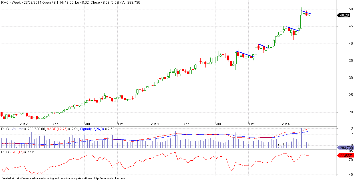 RHC has been trending up for 5 years now, seeing its share price increase fivefold. The last several months in particular have seen a noticeable pattern of impulsive moves up followed by corrective declines every now and then. The stock looks overbought but no reversals are yet evident. As a result, the strategy would have to be to buy any dips and not get too greedy because it won’t be long until the uptrend resumes. At this point in time, the previous swing low is at $41.06 so as long as it holds that level, the trend is still bullish.