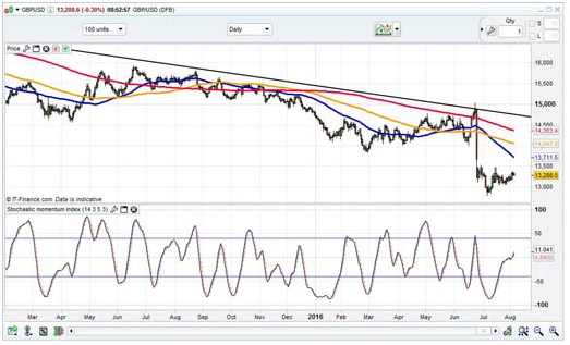 GBP/USD caught in a bearish trendJuly’s tale has been replicated in August, namely that $1.34 continues to be too much of a barrier for upside progress here. The pair remains stuck in a bearish trend, with little sign that a real upward move is on the cards – today’s Bank of England meeting has certainly stayed the hand of sterling bulls, with the ongoing tide of negative data not helping matters.