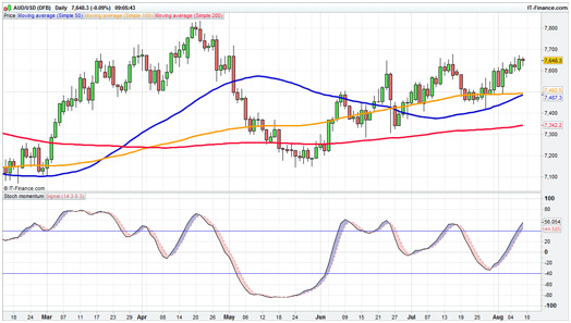 AUD/USD may test April highsThe pair does not look excessively overstretched to the upside, but it continues to falter around $0.7650. Buying dips has made sense for months here, so any weakness into the second half of August is to be welcomed.