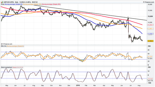 GBP/USDIt hasn’t exactly been a great week for shorts, but the ‘sell the rally’ approach still has merit. Continued weakness could see a move to the July lows of $1.28, and even a sustained rally would provide an attractive moment for fresh short positions.