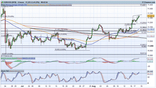 EUR/USD gains after FOMC minutesEUR/USD managed to regain lost ground yesterday, following a dovish set of FOMC minutes which provided a drag upon the dollar across the board. We are looking for a reversal from these areas, given the fact that the recent rally looks like a retracement of the referendum downturn. Thus, while yesterday didn’t help the cause we are still looking for signs of a bearish reversal. Currently EUR/USD is facing trendline resistance, which has the potential to push the pair lower. While a bearish view is in play, it makes sense to await a break and hourly close back below $1.1241 to provide confirmation.