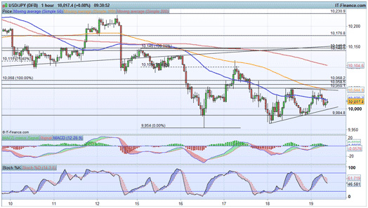 Given the bearish move into this pattern, the preference is for another move lower, with a break below ¥99.84 looking towards the ¥99.54 support level. Alternately, an hourly close above ¥100.50 would look towards ¥101.20 for a potential wider double bottom formation to come into play.