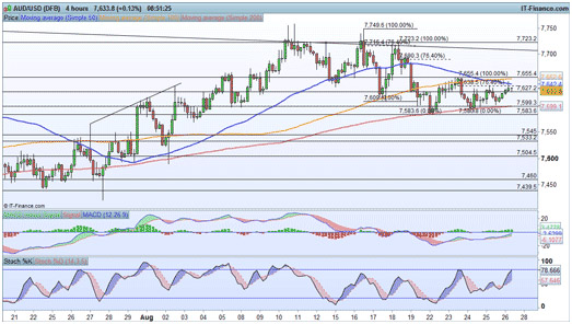 Given that price is currently at the 70% retracement between $0.7655 and $0.7583, it gives a 2:1 trade for a move back down to the lows rather than a break higher. Alternately, one could wait for another move back into the 76.4% level for a 3:1 option. Either way, a bearish view is in play unless we see an hourly close above $0.7655.