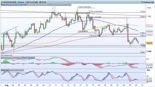 AUD/USD expected to tumble once moreAUD/USD has been sent lower since topping out in recent weeks, putting the pair on a bearish pathway once more. The retracement towards recent support at $0.7583 appears to be over, and a move back down below $0.7525 is now expected. With that in mind, a bearish view is in place unless we see an hourly close above $0.7583.