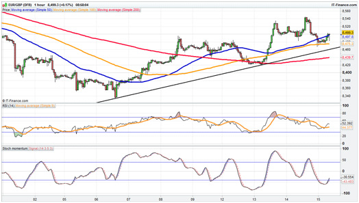 EUR/GBP continues its move higherThe uptrend off the lows of 6 September remains intact, with the dip from Tuesday met by furious buying. Support in the early part of today’s session was found around £0.8480.