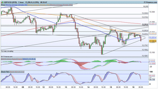GBP/USD resurgence coming into questionGBP/USD is turning lower from trendline resistance this morning, with the pair trading within a symmetrical triangle formation. We are breaking through trendline support, yet the key here is the ability to post an hourly close below $1.3179 (for a bearish outlook) or above $1.3279 (to provide a bullish short-term outlook).
