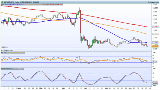 GBP/USD suffers more lossesThe downward trend goes on here, with little sign so far that the pair is about to turn higher. The lows of July and August, around $1.2850, are holding for now, so until this breaks we are still looking at a possible bounce in coming days.