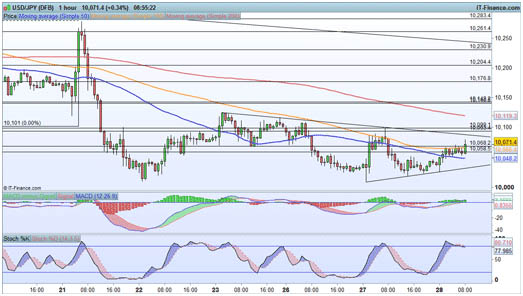 As such, we are approaching interesting areas to get short of this market on the premise that firstly we will continue this pattern by selling back into trendline support, and secondly we will ultimately break out the bottom of this pattern. Thus a bearish short-term outlook remains, with an hourly close above ¥100.99 required to negate this view.