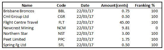 Ex-dividendsSeveral companies are going ex-dividend today. They are: Brisbane Broncos, CML Group, Flight Centre, Newcrest Mining, Northern Star Resources, Peet Limited and Spring FG.