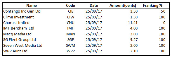 Ex-dividends8 companies are going ex-dividend today. Chorus Limited is paying 11.41 cents unfranked, SG Fleet Group is paying 9.27 cents fully franked, and WPP is paying 2.1 cents fully franked.