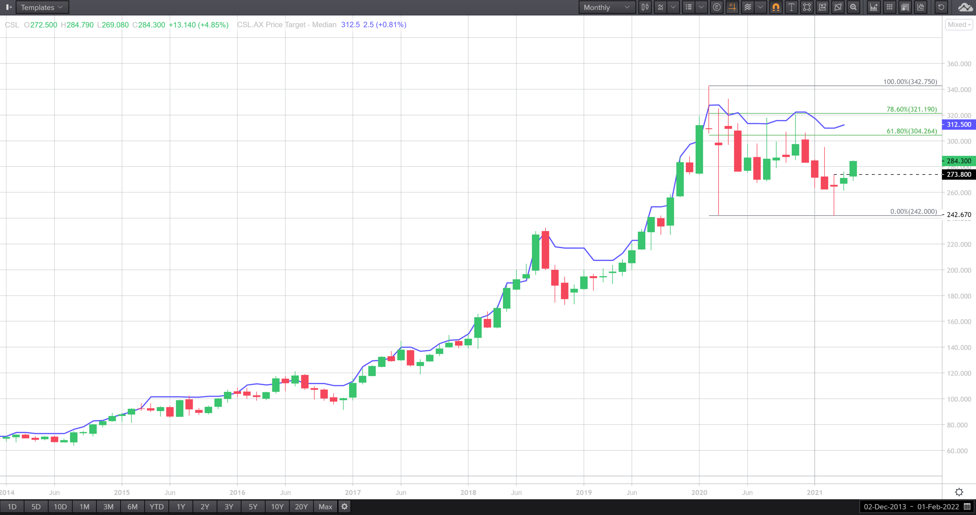 (ASX:SEQ) rates CSL as a buy. From a technical angle, CSL is bullish for a number of reasons. Before I go into it, we are using a long term chart with each candle representing one month’s worth of trading. On the grey horizontal line, support was around the $242 mark in March and at the end of that month, a bullish doji formed suggesting an emerging positive sentiment. If you look at the horizontal dashed line, the break of $273.80 in both April and May signals upward traction with accelerated momentum indicating a continuous uptrend. Now should this bullish case unfold, the next range is between $304.26 and $321.19 if you look at the green line (this is made up of the 61.8 per cent and 78.6 per cent Fibonacci retracement). The purple line which looks like a moving average is actually the ‘forward 12-month median analyst valuation, which shows a target price of $312.50. Shares in CSL