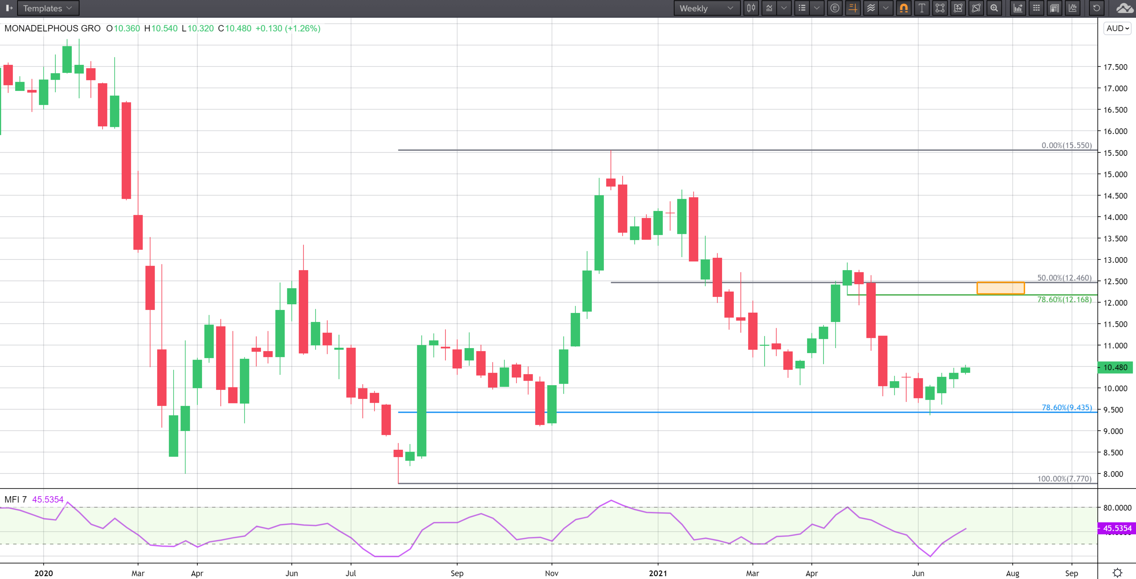 Taking a step back, the share price has declined by almost 40 per cent. This is measured from the December 2020 high of $15.55 down to the June 2021 low of $9.37. Breathing a sigh of relief, support held at the 78.6 per cent Fibonacci retracement of $9.43 which is indicated by the horizontal blue line in mid-June. A bullish doji also formed, which is indicative of seller exhaustion.
