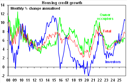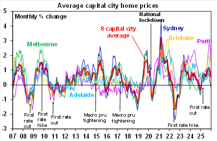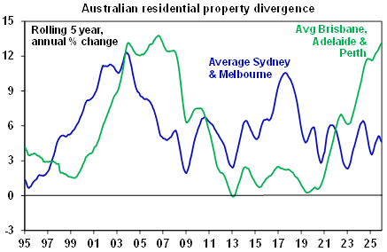 However, price gains slowed in December to 0.7%mom after peaking at 1.2%mom in October. Sydney and Melbourne actually saw prices fall slightly and while Brisbane, Adelaide and Perth continued to boom, Brisbane and Perth are showing some signs of slowing. The slowdown was most pronounced in capital cities, with regional prices up 1%mom in December and 9.7%yoy in 2025.