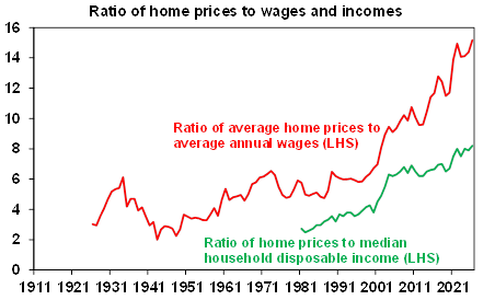 - Housing affordability has deteriorated further from already very poor levels. This is evident in the ratio of home prices to wages and incomes being at record levels. This could limit the upside in property prices – although we and many others have been saying that for years!
