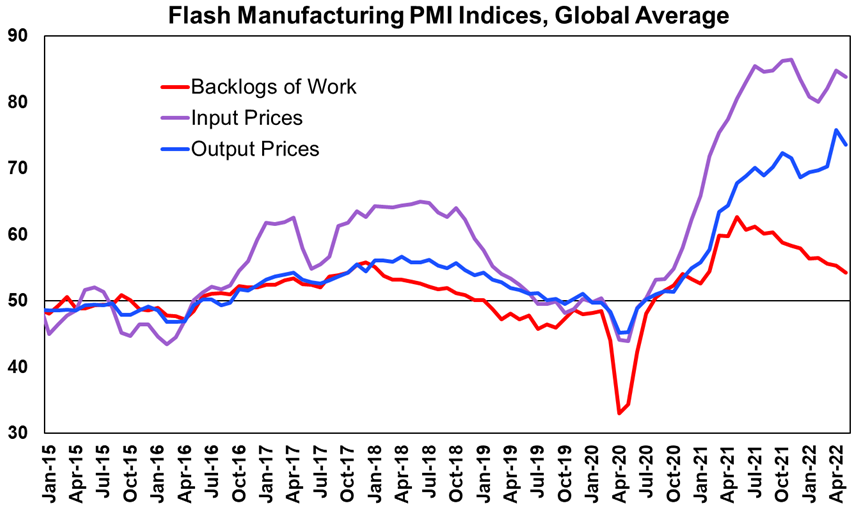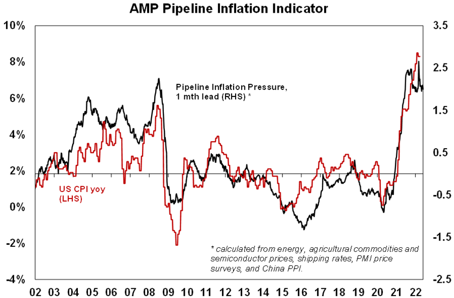 Of course, it is dangerous to read too much into central bank comments either way. Just over 6 months ago the Fed was saying it could be patient in removing monetary stimulus and the RBA was indicating a rate hike was unlikely before 2024. Ultimately central banks are data dependent. And they want to see clear evidence that inflation is cooling. There are some positive signs on this front though: business surveys are reporting improving delivery times, reduced backlogs and some topping in input and output price pressures; US retailers have seen an increase in inventories presumably as spending rebalances back to services and production catches up; there are some signs of a slowing in hiring in the US with initial jobless claims starting to trend up, Amazon saying its gone from understaffed to overstaffed and giving up space and Lyft pausing hiring; wages growth in the US looks to have peaked late last year; and our Pipeline Inflation Indicator continues to point to a peaking in US inflation.