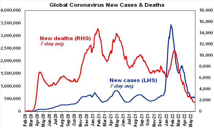 New global Covid cases fell slightly over the last week with a further decline in Europe. New cases continued to trend down in China and have now rolled over in South Africa again.
