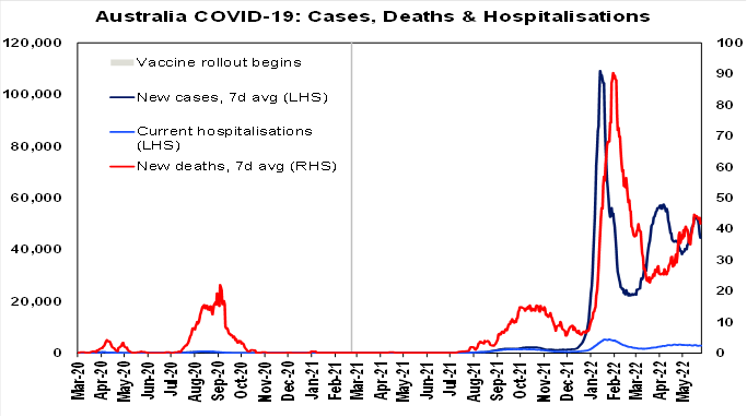 The recent rise in new cases in Australia has rolled over again and hospitalisation and death rates remain low compared to pre-Omicron waves.