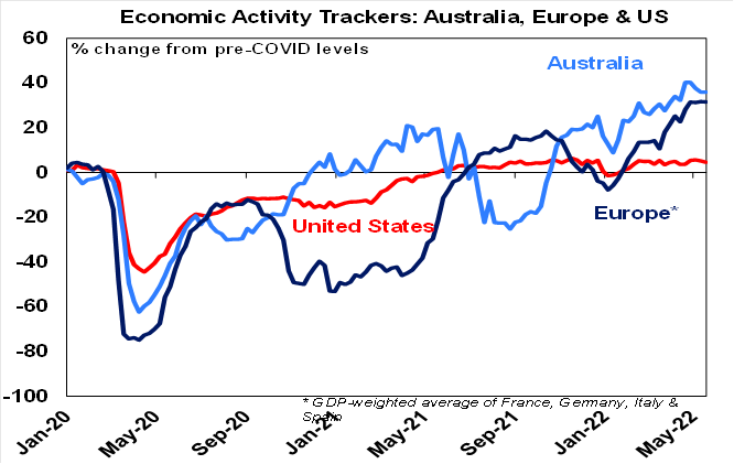 Our Australian Economic Activity Tracker was little changed over the last week but remains strong. Our European Tracker was little changed but the US fell a bit. Given the rising risk of recession our Economic Activity Trackers are worth watching as they are based on weekly data and so give a timely guide.