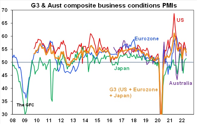 At this stage it’s a bit too early to relax though. Rising oil and hence petrol prices are a fly in the ointment of the “peak inflation” view and commodity prices generally still look strong. This could be accentuated if Europe bans Russian oil (as looks likely) and there is a disruption to Russian gas flowing to Europe. Even if US inflation has peaked it will take a while before its fallen back to levels where the Fed can relax.