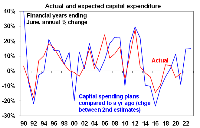 Australian construction hit by supply constraints and floods, but the outlook looks strong. First the bad news. March quarter construction fell 0.9%qoq and this included a fall in dwelling construction as constraints on the supply of building materials and labour impact along with east coast flooding. This weighed down business investment in the quarter which fell 0.3%. All of which is a dampener on March quarter GDP growth. But there was also good news. Plant and equipment investment rose by 1.2%qoq. Business investment plans for 2022-23 rose a solid 12% on 3 months ago and are up 15% on plans for 2021-22 from a year ago pointing to a strong outlook for growth in investment. See the next chart. And there is a huge pipeline of homes that have been approved and commenced but are yet to be completed pointing to plenty of work for home builders still ahead even as housing demand slows with higher mortgage rates and poor affordability.