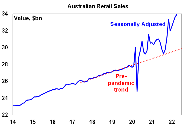 Australian retail sales rose a strong 0.9% in April, taking them to about 15% above their pre-covid trend. This is only partly due to rising prices and mostly reflects the surge in goods demand through the pandemic so it will likely slow as demand continues to rotate back to services. In the meantime, consumers still seem to be spending despite cost-of-living pressures – helped along by the strong jobs market and excess saving built up through the pandemic.