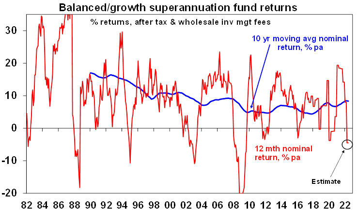 A rough financial year. Thanks to central bank monetary tightening on the back of the worst inflation break out in decades not helped by the invasion of Ukraine, bond yields surged over the last financial year (resulting in an 8-10% loss for bonds) and shares fell (with Australian shares returning -6.5% and global shares returning around -10%). As a result, balanced growth superannuation funds are estimated to have seen a negative return of around -3 to -5% over the last financial year. No one likes to see their wealth fall but its wise to bear in mind that: periodic share market falls are normal; as a result super funds also have periodic setbacks; but the longer term returns from shares and super are solid with the latter averaging a 7.5%pa return over the last 30 years; switching to cash after a fall will just turn a paper loss into a real loss; and when shares fall they are cheaper offering higher long term return prospects.