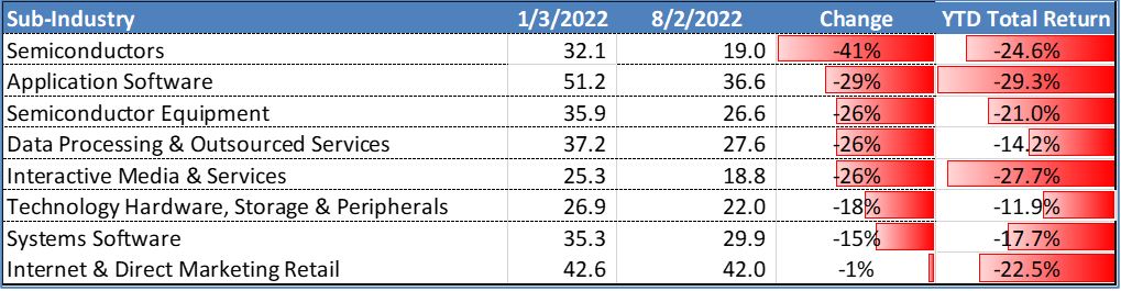 Tech and internet Price/Earnings ratios in 2022The compression of earnings multiples has been a significant factor in tech returns in 2022 as investors incorporate higher discount rates in stock valuations.