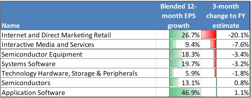 MSCI All-Country World Technology Index earnings estimates by sub-industryWhile software stocks have proven relatively resilient in the face of a slowing economy, e-commerce and internet companies that rely upon digital advertising face stronger headwinds than they did earlier in their life cycles.