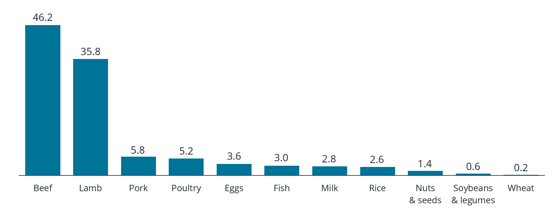 Chart 1: GHG intensity of various foods, (kg of CO2e per kg of protein)