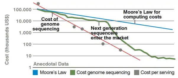 Source: BCG Analysis. NASSCOM Report: AI, Beyond the Myth & the Hype, McKinsey Global Institute analysis. 2019 SaaS Trends, Blissfuly.com. The views are those of the manager and are subject to change. For illustrative purposes only.The ability to operate on an electron level allows for developments in the synthetic world that were not viable only a few years ago. In just the same way that Moore’s Law has driven down the cost of genome sequencing, it has also driven down the cost of producing synthetic meat, for example. The chart below shows that in the words of Ron Shigeta, the co-founder of science accelerator IndieBioshows, “lab-grown meat is scaling like the internet”.