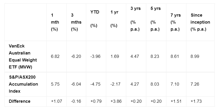 MVW vs S&P/ASX 200 Index – A more balanced approachMVW equally weights the largest and most liquid stocks on the ASX at each rebalance. Because of this, at last rebalance, no company was more than 1.17%. What this means is that if ANZ or CBA goes up or down 2%, its impact on the S&P/ASX 200 is greater than on MVW. MVW’s exposure to the big four banks is currently less than 5%.