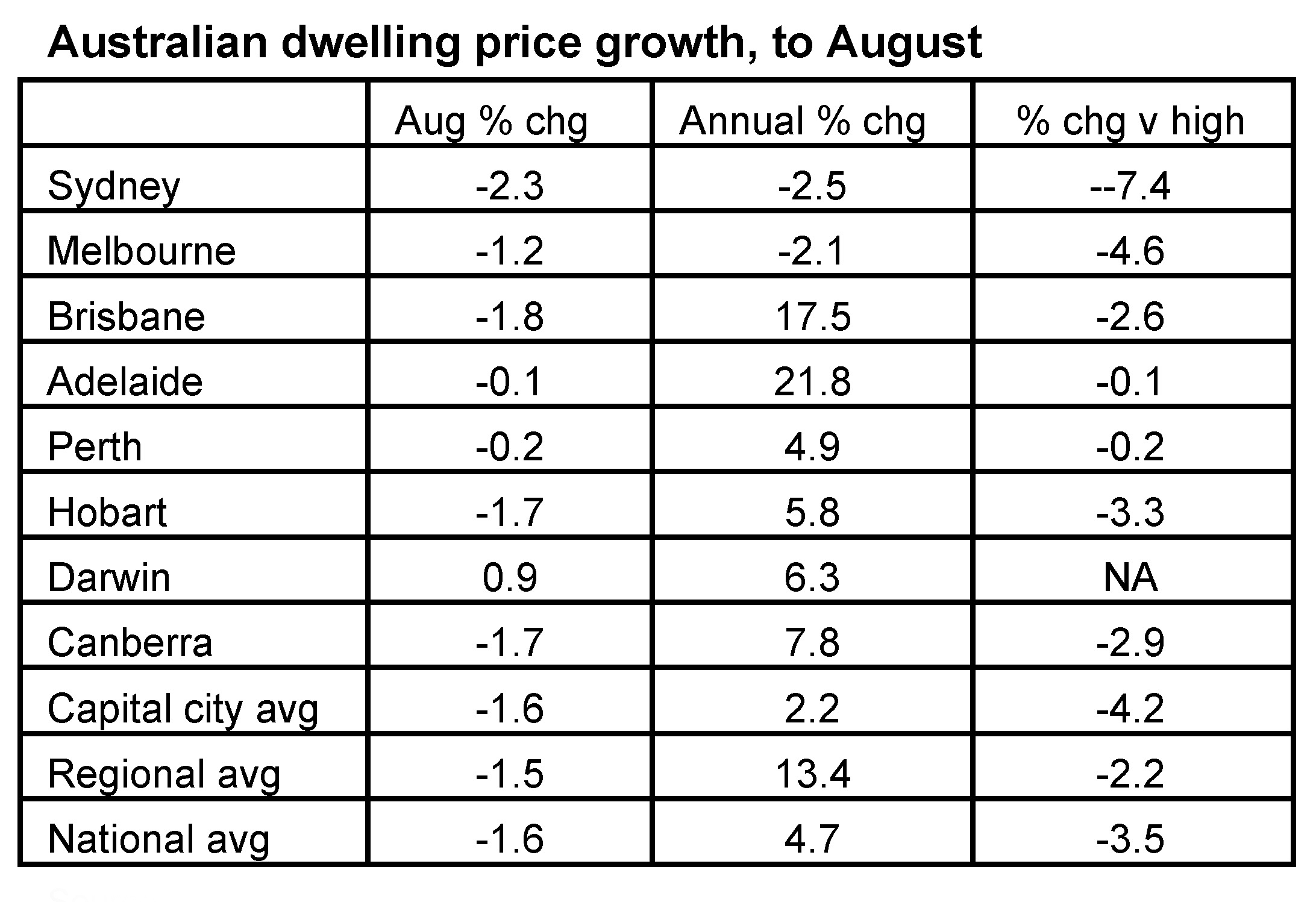 Australian dwelling prices fell another 1.6% on average in August according to CoreLogic, their fourth monthly decline in a row, and their fastest monthly decline since the early 1980s recession. After surging 28.6% between their pandemic low in September 2020 to their high in April, average property prices have now fallen 3.5%, which is comparable to the pace of decline over four months going into the 1980s & 1990s recessions and the GFC. Prices fell 2.3% in Sydney for the sixth monthly decline in a row and they are now down 7.4% from their high. Seven of the eight capitals saw declines.