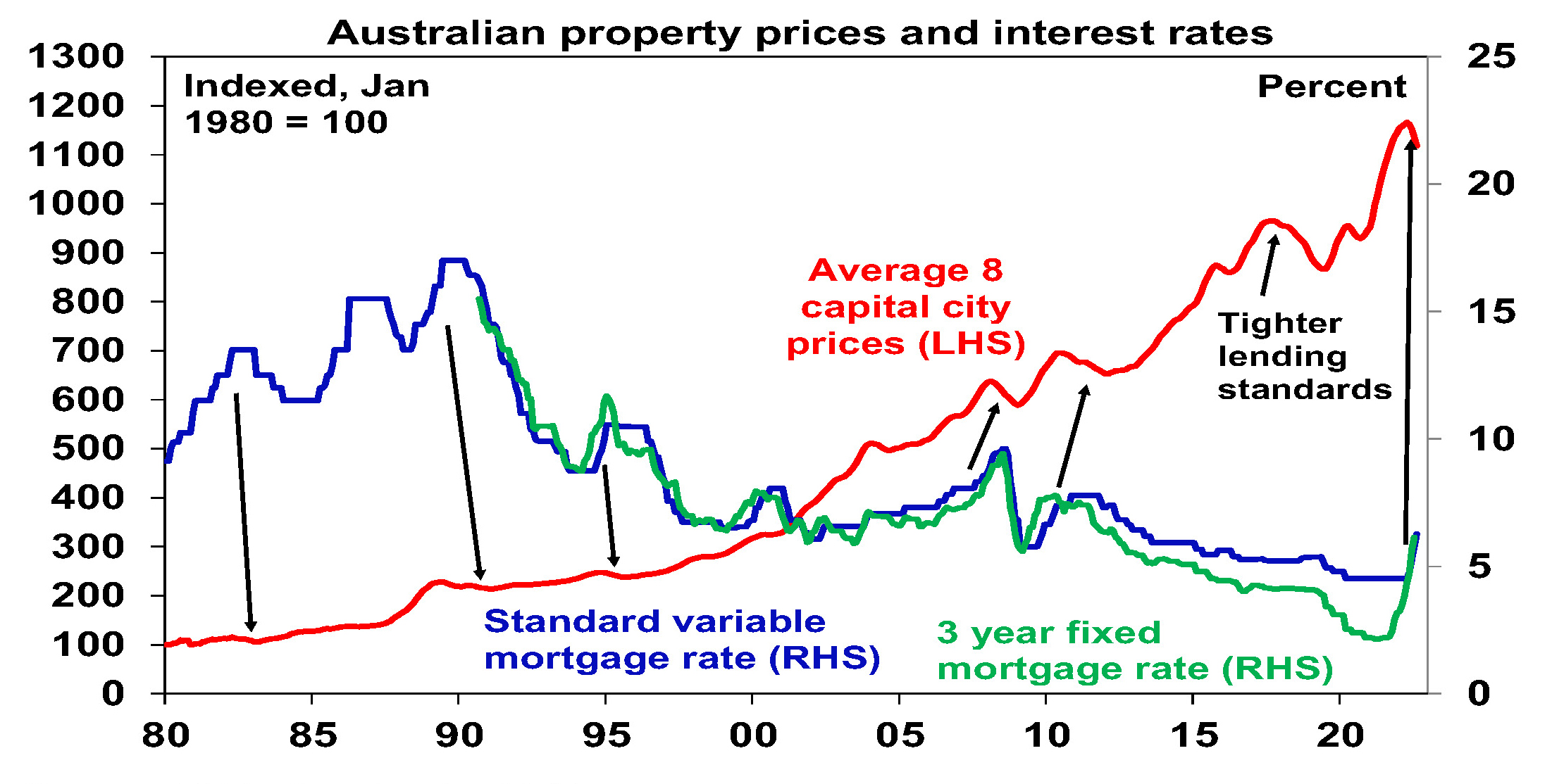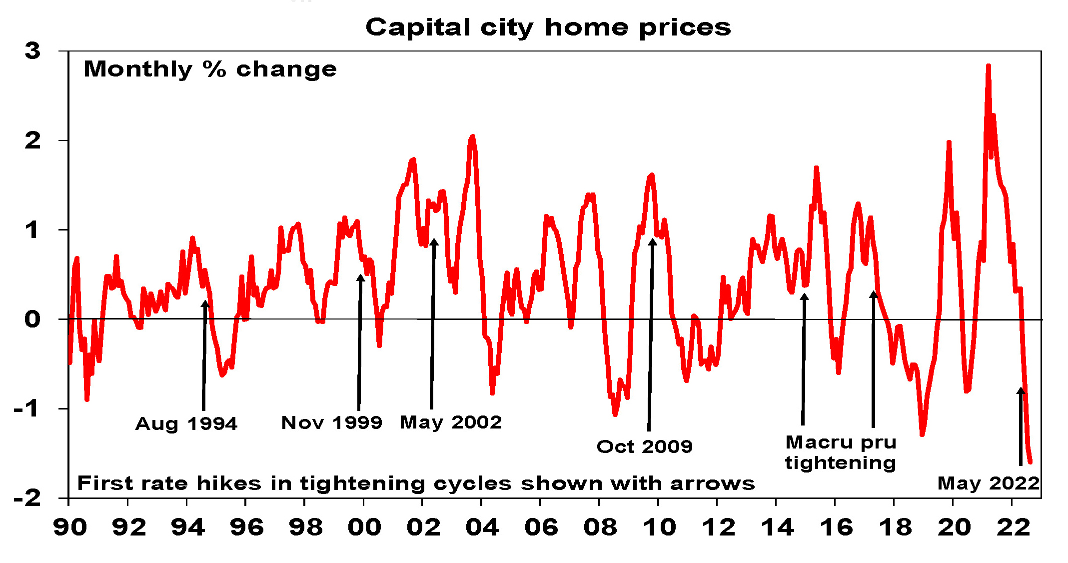 - Rising mortgage rates are the main driver and there is likely more to go. We continue to expect a 15-20% top to bottom fall in home prices out to the second half of next year, followed by a gradual recovery.
