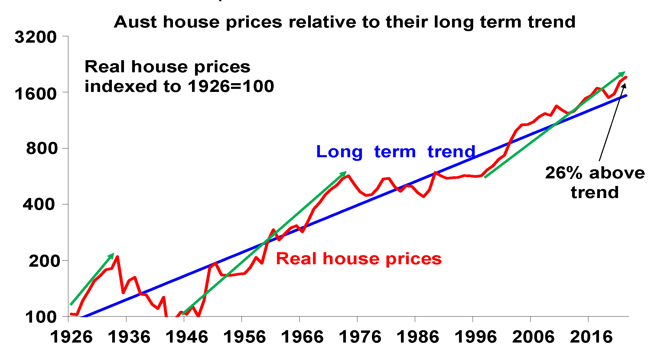 The boom over the last 25 years has seen real property prices rise from about 23% below their very long-term trend to 26% above. It has been largely driven by the shift to low interest rates and a surge in population relative to housing supply.