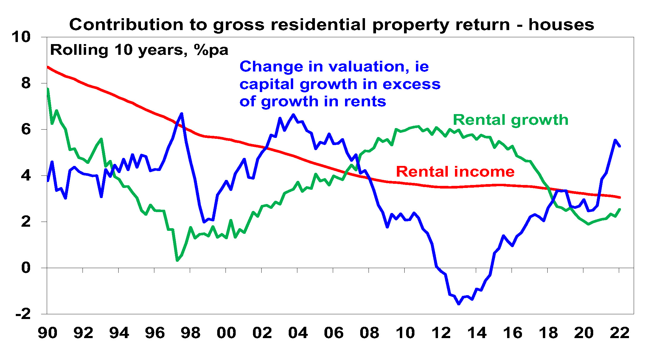 Looked at from a purely investment perspective, lower inflation drove lower interest rates which in turn pushed up home prices relative to rents leading to a collapse in property rental yields - just as bond yields and yields on shares fell over the last few decades into their recent lows as inflation fell. The gross rental housing yield has fallen from over 8% in the early 1980s to a recent low of around 2.2%. The next chart breaks down the contribution to rolling gross 10-year housing property returns in Australia from rents (ie, the gross rental yield) and capital growth “due to” rental growth and changes in valuations (ie, the rise in prices relative to rents). Of course, this is a rough guide only as it assumes that rents from rental property are a good guide to the underlying services owner-occupied property provides. But it indicates that the decline in rental yields since the 1980s on the back of lower inflation and interest rates has boosted house prices by around 3% pa, or around 45% of the total increase in house prices. In other words, if inflation hadn’t fallen, driving interest rates down, which in turn drove home prices up and rental yields down annual home price growth since the 1980s may have been up to 3% pa lower.