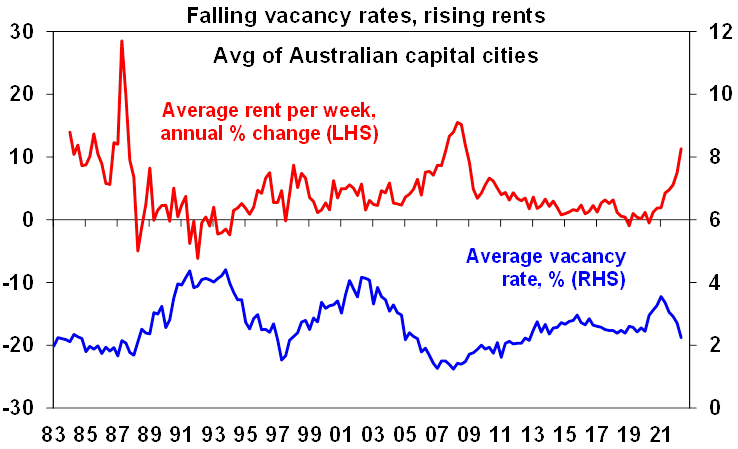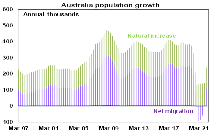 Population growth rebounded to 0.9% over the year to the March quarter reflecting the return of net immigration. Net immigration rose to 96,000 people in the March after being negative through 2020-21. Monthly arrivals data points to a further pick up. Population growth was strongest in Queensland thanks to interstate migration but NSW and Victoria are picking up reflecting the return of immigrants.