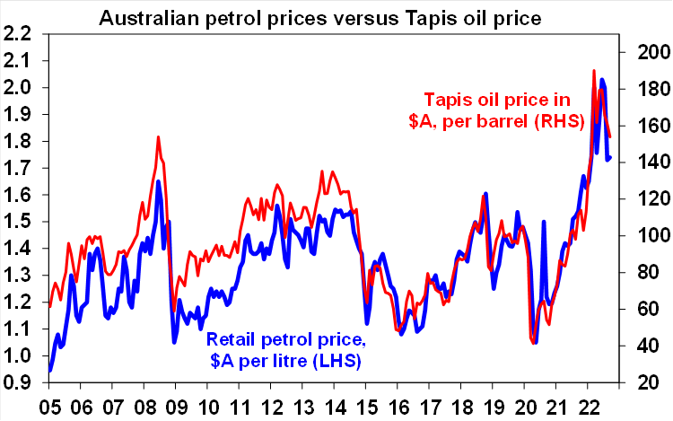 Australian fuel excise cut to end Wednesday adding 25 cents a litre to petrol prices. The fuel excise cut in March made political sense ahead of the election but was of dubious merit economically – it would have been better to use the $3bn it cost to provide direct help to low and middle income earners and it doesn’t appear until recently to have led to fuel prices substantially lower than what otherwise would have been the case. See the next chart. In the interest of the budget and sending a long-term message to motorists to switch away from using petrol it makes sense that it ends on schedule. The reversal of the cut will push average petrol prices up to around $1.90 a litre. Some service stations look to have already started to anticipate it and fortunately, global oil prices have been falling and so this may offset some of the impact.