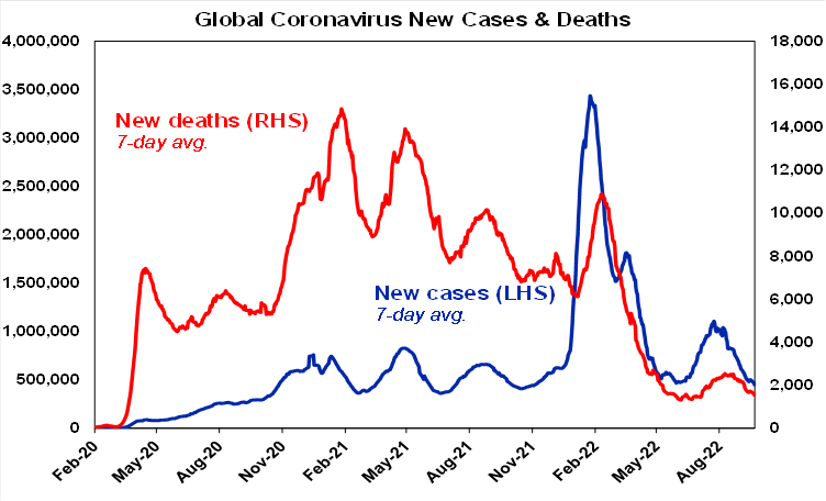 New global covid cases and deaths are continuing to trend down. This includes in Australia. Cases in China are low and trending down, but the risk of more lockdowns remains high.