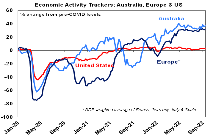 Our Australian, US and European Economic Activity Trackers were little changed in the last week. Overall, they continue to suggest that while some momentum has been lost after the recovery from the pandemic, economic activity is holding up reasonably well so far – but this likely reflects the usual lags from monetary tightening.