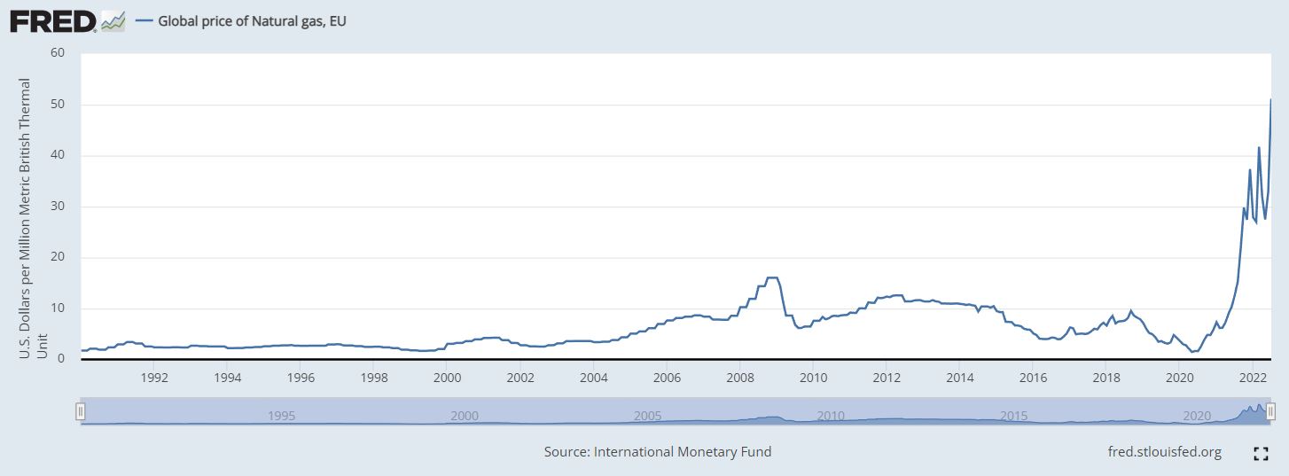 [10] Japan is overcoming its Fukushima fears and returning to nuclear power. Southeast Asia is using coal to replace the liquified natural gas diverted to Europe. South Asia is suffering blackouts because energy is unaffordable. US natural gas prices in August breached US$10 per million BTU, a 400% increase on the recent years, due to demand from Europe.