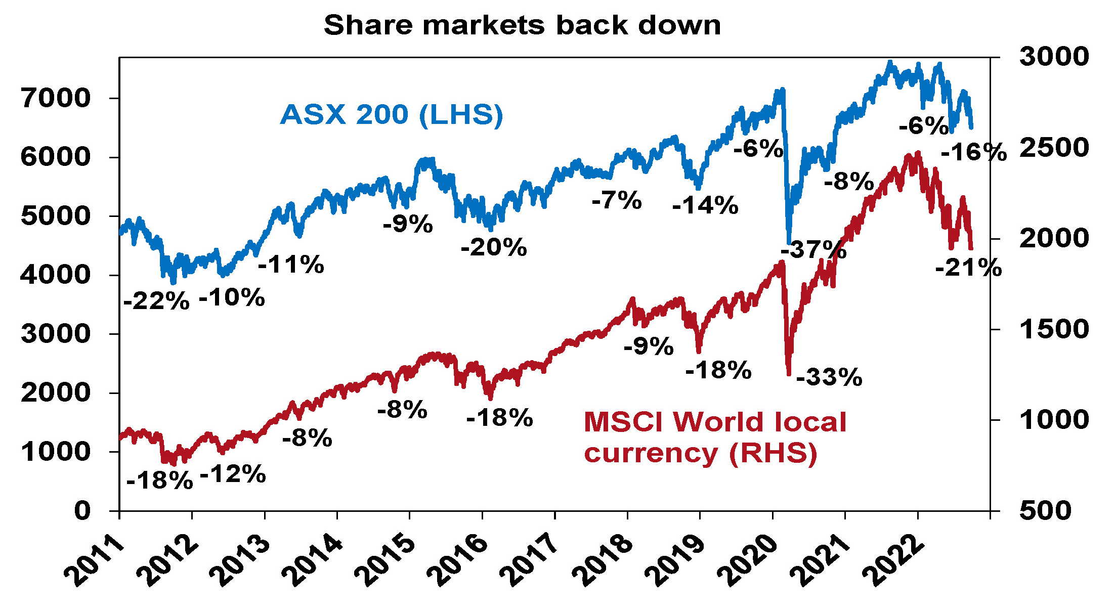 IntroductionInvestors could be forgiven for looking back on the pandemic years of 2020 and 2021 with fond memories – because after the initial shock in February-March 2020 it was a period of strong returns and relative calm in investment markets. This year has been anything but. After falling sharply into mid-June (at which point US shares had fallen 24% from their highs, global shares 21% and Australian shares 16%), share markets rallied into mid-August reversing half of their declines on the back of hopes the Fed would pivot towards an easier monetary stance and hopefully avoid a recession. Since mid-August though shares have fallen again and are now back to around their June lows.