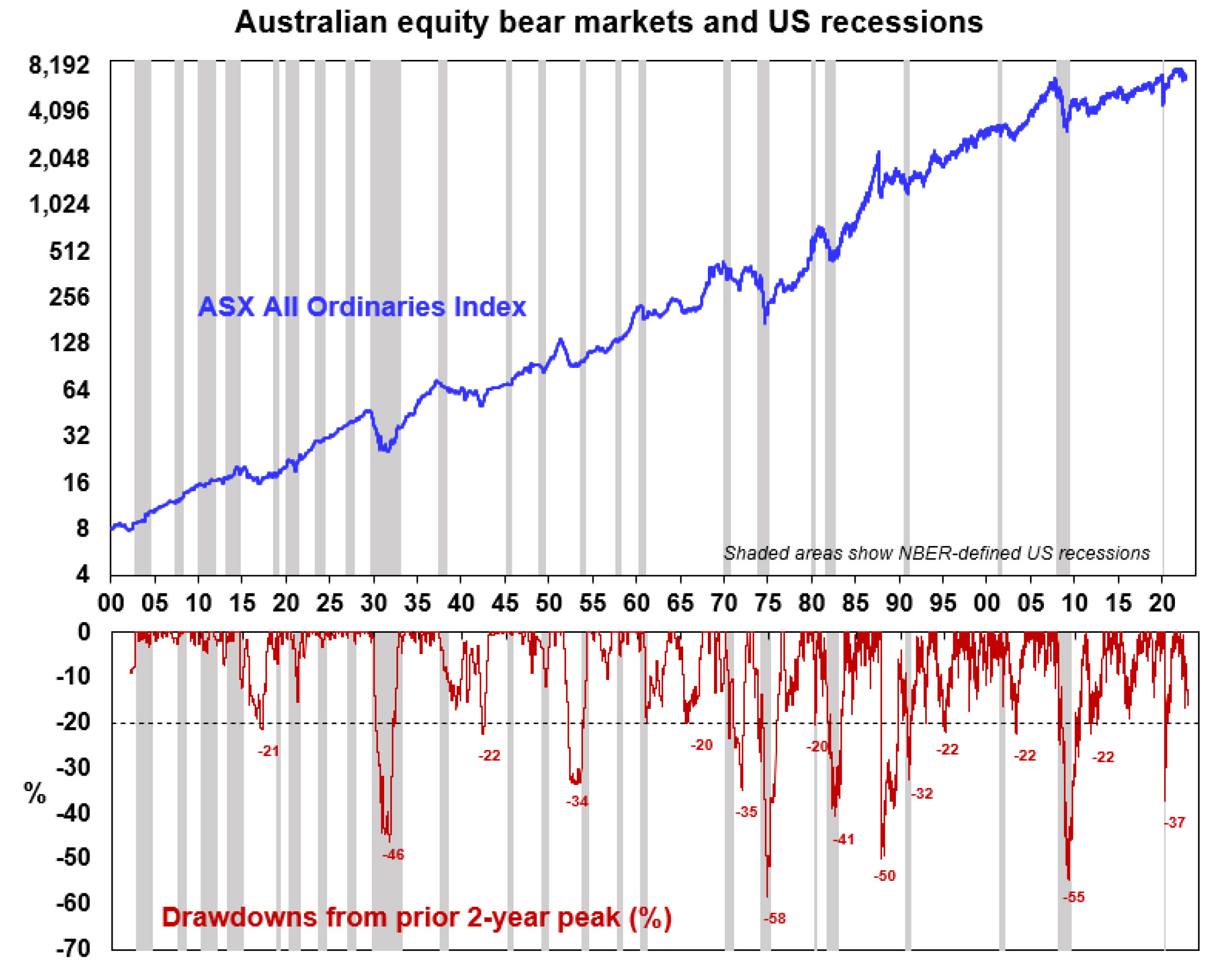 - Increasingly hawkish central banks are bad for shares in the short term for two reasons. First higher interest rates and make shares less attractive from a valuation perspective. Second, a recession would weigh on company profits. Recession is now almost certain in Europe and about a 50% probability in the US. In Australia the probability of recession is now around 40% (if as we expect the cash rate peaks around 3%, but if it rises to 4.3% as predicted by the money market then recession is probable here). Historically deep bear markets in US and Australian shares have tended to be associated with a US recession.