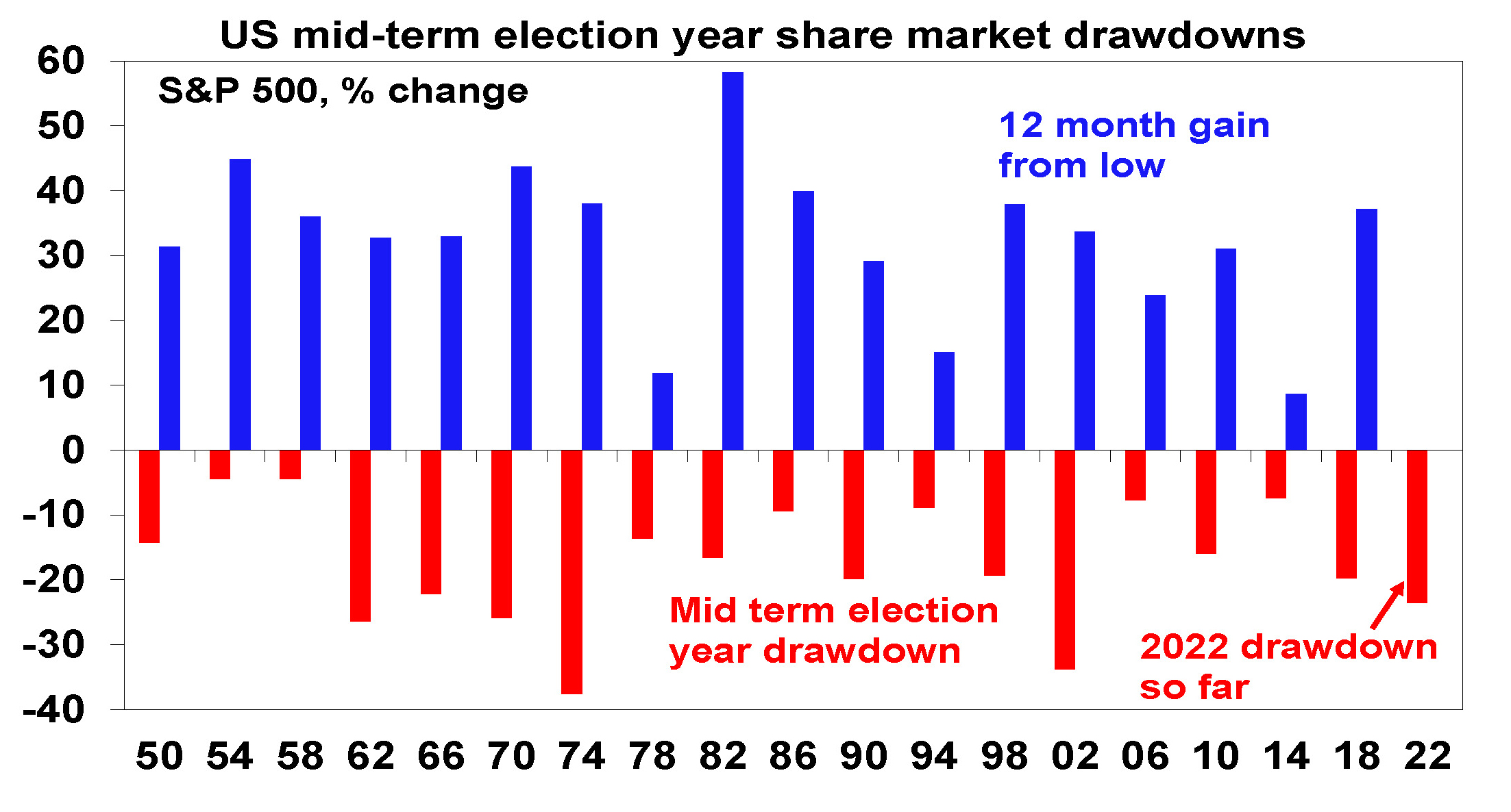 - Post US mid-term election returns tend to be strong, just as mid-term election year drawbacks tend to be more severe - with an average top to bottom fall of 17% in US shares in mid-term election years followed by an average 33% gain one year from the low.