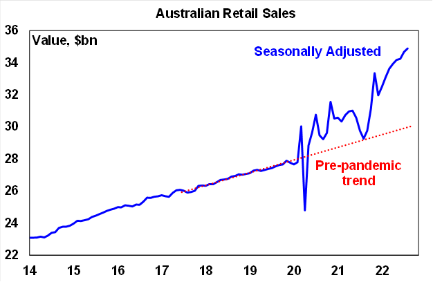 That said, the upside surprise in retail sales on the back of still strong jobs data and ongoing high and still rising inflation adds to the risk that the RBA will hike by another 0.5% next week, whereas we continue to think they should be slowing the pace of hikes to better allow time to assess the impact of past hikes and allow for their lagged impact.