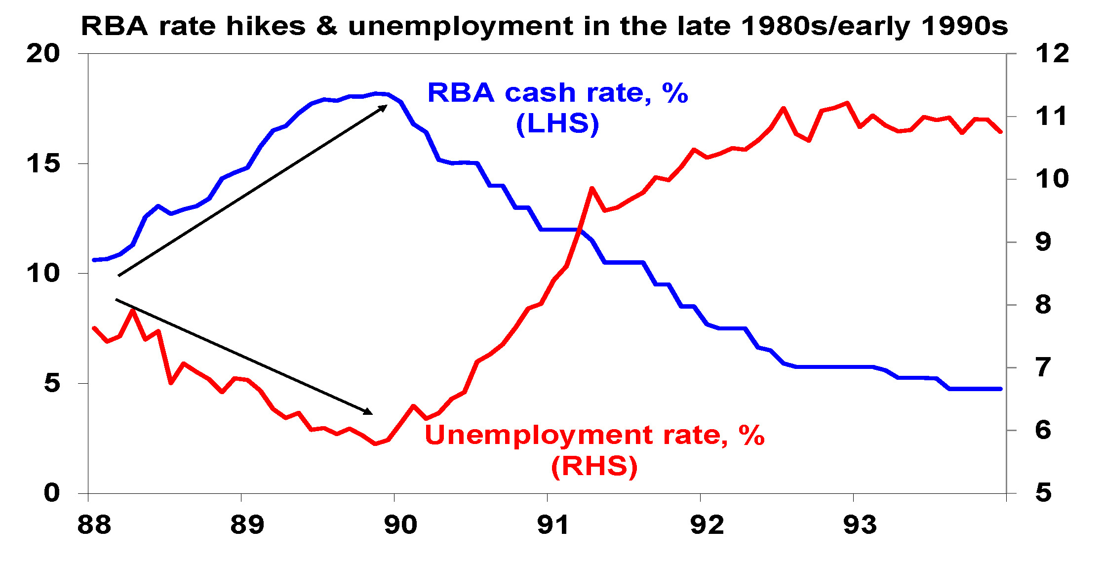This is because it takes 2-3 months for RBA rate hikes to impact actual variable rate mortgage payments and then several months before this impacts spending. There are then flow on effects to jobs and business investment with feedback impacts on household which can take up to a year. And this lag may have been lengthened by the rise in fixed rate lending around 2020-21 that saw it rise from 15% of total mortgages to around 40%. The lag was clearly evident in the late 1980s and early 1990s – see the next chart.