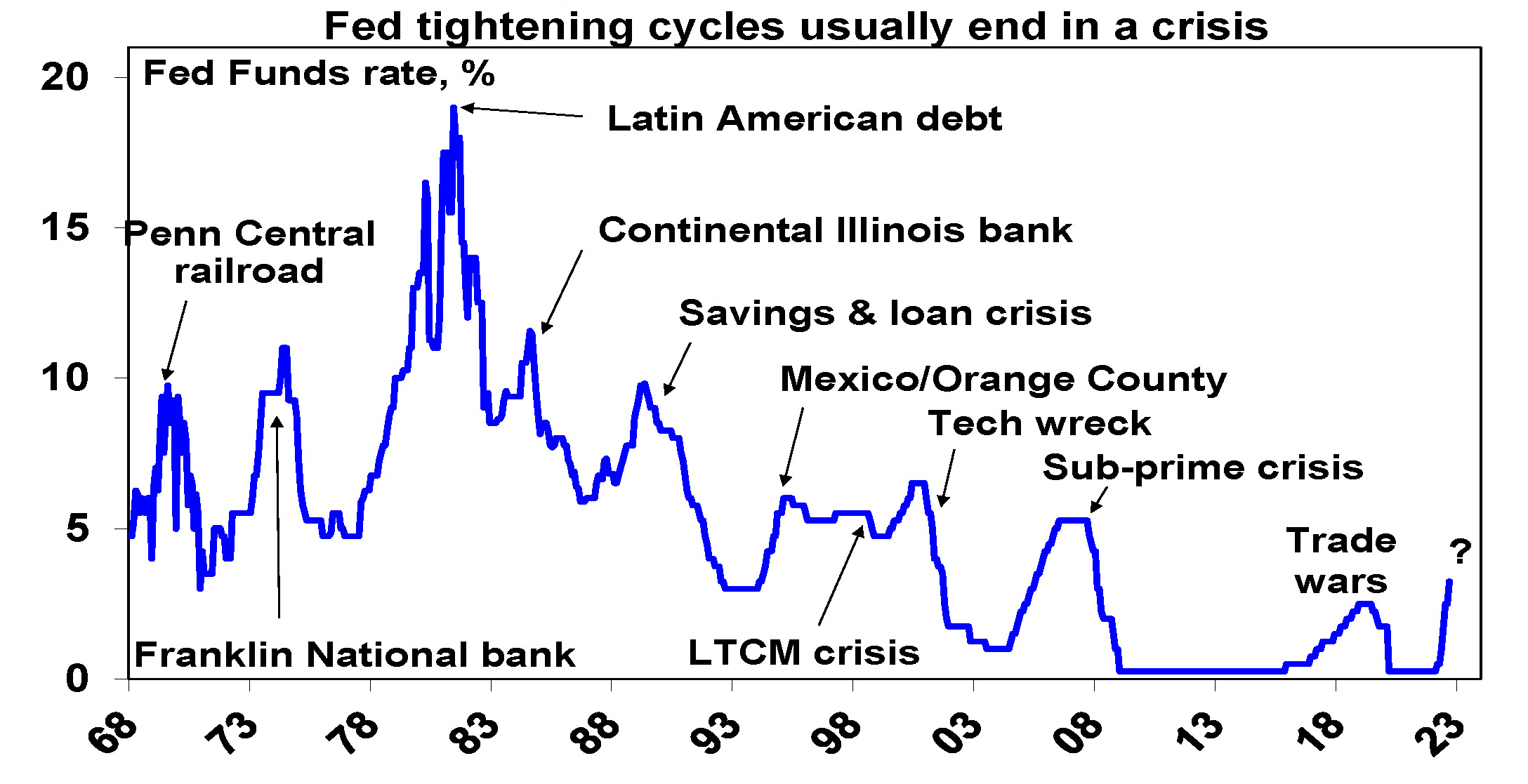 The 23% plunge in global share markets, falling commodity prices, central banks including the Fed willing to risk recession, the Fed’s record of tightening cycles ending in a crisis (next chart), the rising skittishness of financial markets, the deteriorating global growth outlook and domestically very low consumer confidence and rapidly weakening housing indicators warn of much weaker conditions ahead which will hit jobs & drive weaker inflation. Aggressively tightening into all this without pausing for breath risks knocking the Australian economy into a recession we don’t have to have.