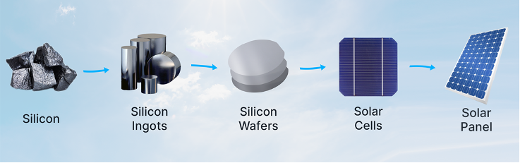 Firstly, polysilicon – a high-purity form of silicon – is melted at high temperatures to form silicon ingots.