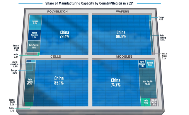 Source: Visual Capitalist. Visualizing China’s Dominance in the Solar Panel Supply Chain. 30/8/2022.In 2010, China made up 55% of the global solar panel manufacturing capacity. In 2021, the average share of the solar panel supply chain increased to 84%, with China controlling at least 75% of every single key stage of the solar PV panel manufacturing process – from forming polysilicon to ingots, to connecting finished solar cells onto panels.